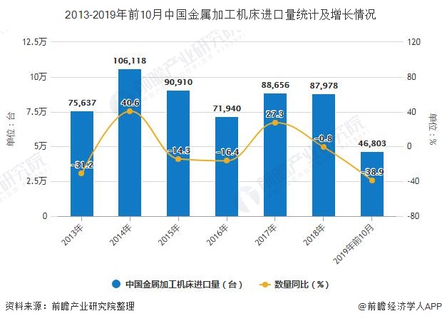 据中国海关总署统计数据显示,2019年10月中国金属加工机床进口量为4216台,同比下降19.7%。累计方面,2019年1-10月中国金属加工机床进口数量达到46803台,同比下降38.9%。