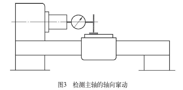 粗车采用夹一端,顶一端,目的是为了增加工件的刚性,使其能够承受较大的切削力矩。精车采用两顶并用死顶尖来保证工件的基准统一原则,最大限度地一次装夹加工出多个外圆和端面。在车削蜗杆前,为保证加工精度要先调整好主轴和丝杠的轴向窜动。调整主轴轴向窜动的方法是把短检验棒插入主轴锥孔,检验棒中心孔内放一钢珠,将百分表架固定在溜板上,百分表测量头压在钢球上,主轴缓慢转动,测得百分表读数的最大差值就是主轴的轴向窜动误差,如图3所示。调整丝杠轴向窜动的方法是将钢珠放入丝杠中心孔内,让开合螺母在丝杠中段处闭合,旋转丝杠,百分表读数的最大差值即为丝杠的轴向窜动误差,如图4所示。调整所有滑板镶条的松紧度,增大移动时的摩擦力,减小滑板窜动的可能性,防止切削时出现“扎刀”现象。