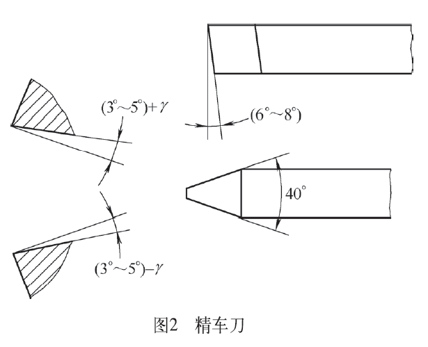 在车削中,由于蜗杆的螺距大、齿型深、切削面积大,因此车削蜗杆刀具必须刃磨合理,装夹正确。蜗杆车刀一般选用切削刃锋利、韧性好且耐冲击的高速钢材料车刀,在刃磨时一定要保证车刀的刀尖角度及两侧刀刃光洁平整。双线蜗杆分轴向直廓蜗杆和法向直廓蜗杆,蜗杆的粗车刀(见图1)径向后角一般磨至6°~8°,纵向前角8°~10°,刀头宽度应小于齿根槽宽,两切削刃之间的夹角略小于两倍齿形角,这样有利于增加车刀的强度,使排屑通畅。蜗杆的精车刀左右切削刃的夹角必须等于两倍齿形角。车削轴向直廓蜗杆的精车刀(见图2)其顺走刀方向的后角为3°~ 5°,相应加上螺纹升角,其背走刀方向后角为3°~5°必须相应减去螺纹升角,纵向前角为0°,这样可获得较高的表面光洁度和齿形精度。