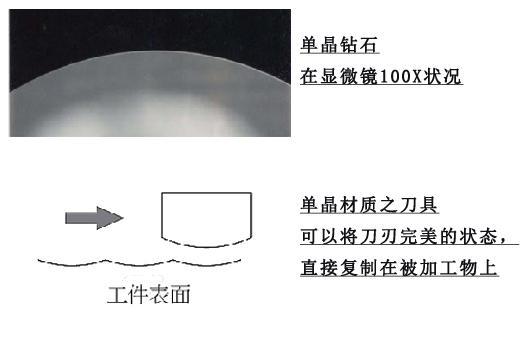 人造金刚石属于Ib型单结晶合成金刚石之一,氮[N]多为分散或固溶状态存在于晶体内部,人造单晶金刚石顾名思义是由人工合成的,在一个无氧且高温(1000°C以上)高压的环境里合成出来的,由于拥有和金刚石相当的高硬度、高耐磨耗与高热传导系数。由于和金刚石同属于单结晶体,无晶界的性质可以制造出非常锋利的刀刃质量,是其他材料无法达到的境界,长久以来被应用在制作超精密加工的金刚石刀具,抛光工具和耐磨耗元件。人造单晶金刚石目前最大尺寸可达8mm。