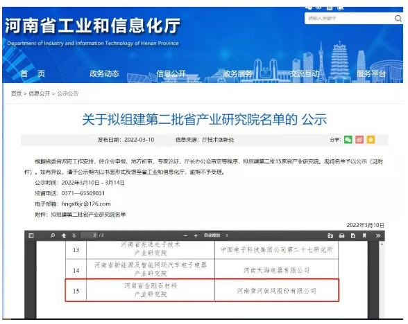 3月10日,河南省工业和信息化厅公布了《关于拟组建第二批省产业研究院名单的公示》,由黄河旋风申报的“河南省金刚石材料产业研究院”名列其中。公示期过后,3月21日,《河南省工业和信息化厅关于组建第二批省产业研究院的通知》(豫工信创新〔2022〕32 号)下发,要求省产业研究院牵头单位要积极吸引高校、科研院所和上下游企业参与产业研究院建设运行工作,探索以创新链、供应链、产业链深度融合为纽带的多样化组建模式,将产业研究院打造成集研发、中试、产业化、工程化于一体的创新联合体。