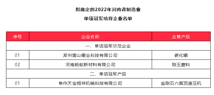 4月26日,中国超硬材料网记者从河南省工信厅获悉,按照《河南省工业和信息化厅办公室关于加强制造业单项冠军企业培育工作的通知》(豫工信办规〔2022〕47号)文件要求,经各省辖市、济源示范区工业和信息化主管部门推荐,省工业和信息化厅组织专家审核评估,将拟确定的2022年河南省制造业单项冠军培育企业予以公示。其中,蚂蚁新材、嵩山硼业获得单项冠军示范企业,天宝桓祥获得单项冠军产品的荣誉。