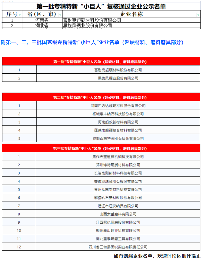 富耐克超硬材料股份有限公司、黑旋风锯业股份有限公司顺利通过第一批专精特新“小巨人”企业复核。