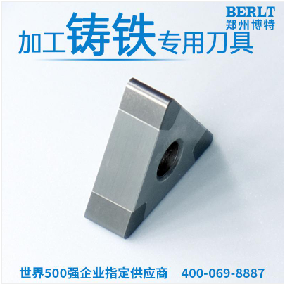 2、抗冲击性强:铸铁毛坯件上常出现硬质点、气孔、表皮激冷层、夹砂等缺陷,常规刀具容易出现崩刃现象,抗冲击性比较差。郑州博特超硬刀具整体PCBN(聚晶立方氮化硼)刀片BTS2800材质,抗冲击性强,不易崩刀,可连续-断续加工不崩刃、不打刀,耐用度比硬质合金刀具高十几倍,可替代进口刀具。